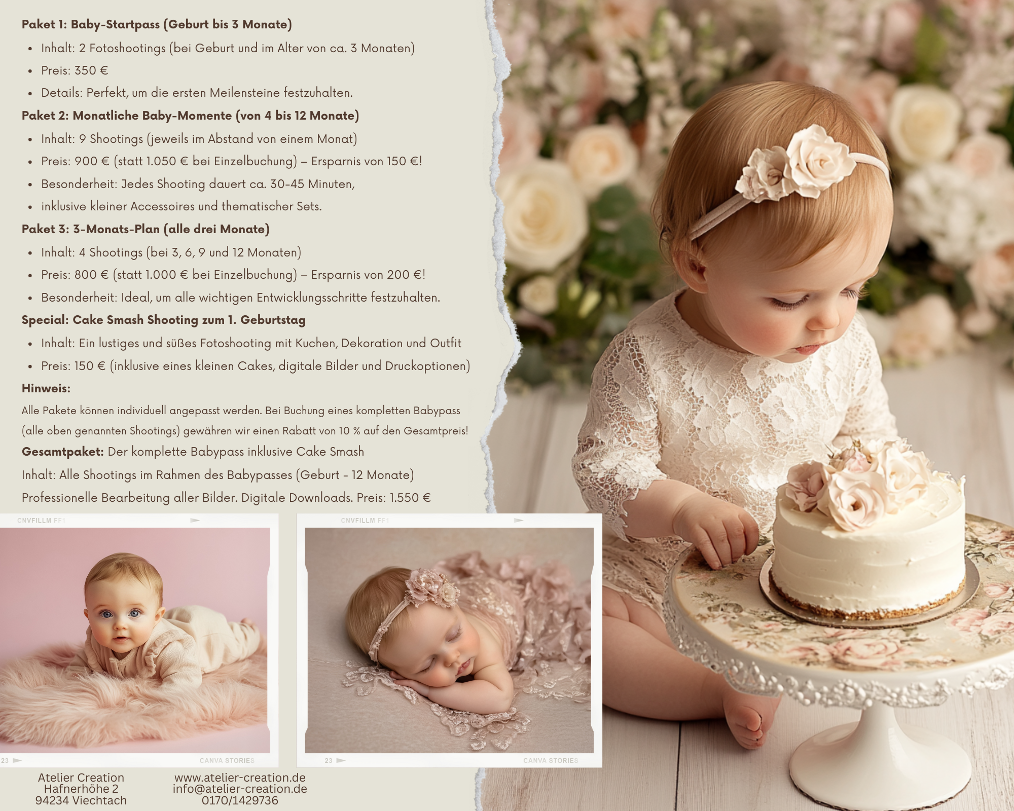 Der Babypass ist ein spezielles Fotoshooting-Paket, das die wichtigsten Meilensteine im ersten Lebensjahr deines Babys festhält. Von den ersten Tagen nach der Geburt bis zum 12. Monat begleiten wir dein Baby bei mehreren Terminen, um die Entwicklung und die besonderen Momente professionell zu dokumentieren. Am Ende entsteht eine wunderschöne Sammlung an Bildern, die euch ein Leben lang Freude bereiten. Der Babypass ist die perfekte Möglichkeit, diese einzigartigen Momente in liebevollen Fotos festzuhalten!